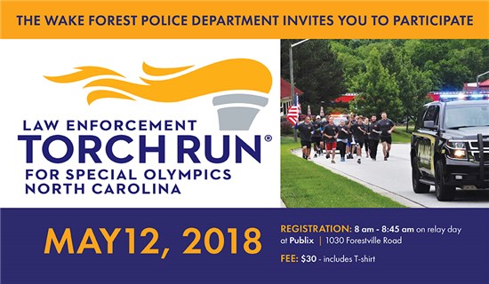 The Wake Forest Police Department is inviting area residents to participate in the Law Enforcement Torch Run for Special Olympics of North Carolina on Saturday, May 12.
