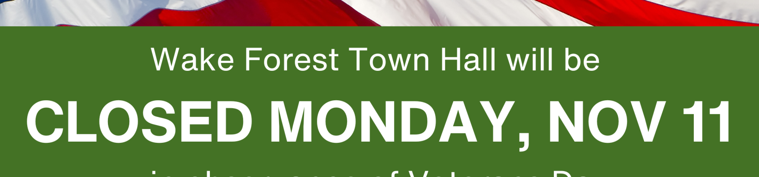 The Wake Forest Town Hall and other administrative offices will be closed Monday, Nov. 11, in observance of the Veterans Day holiday. Yard waste and loose leaf collection will also be suspended on November 11, but trash, recycling, and bulk waste collection will not be interrupted. Go Wake Forest and the Wake Forest-Raleigh Express will also follow the normal schedule.