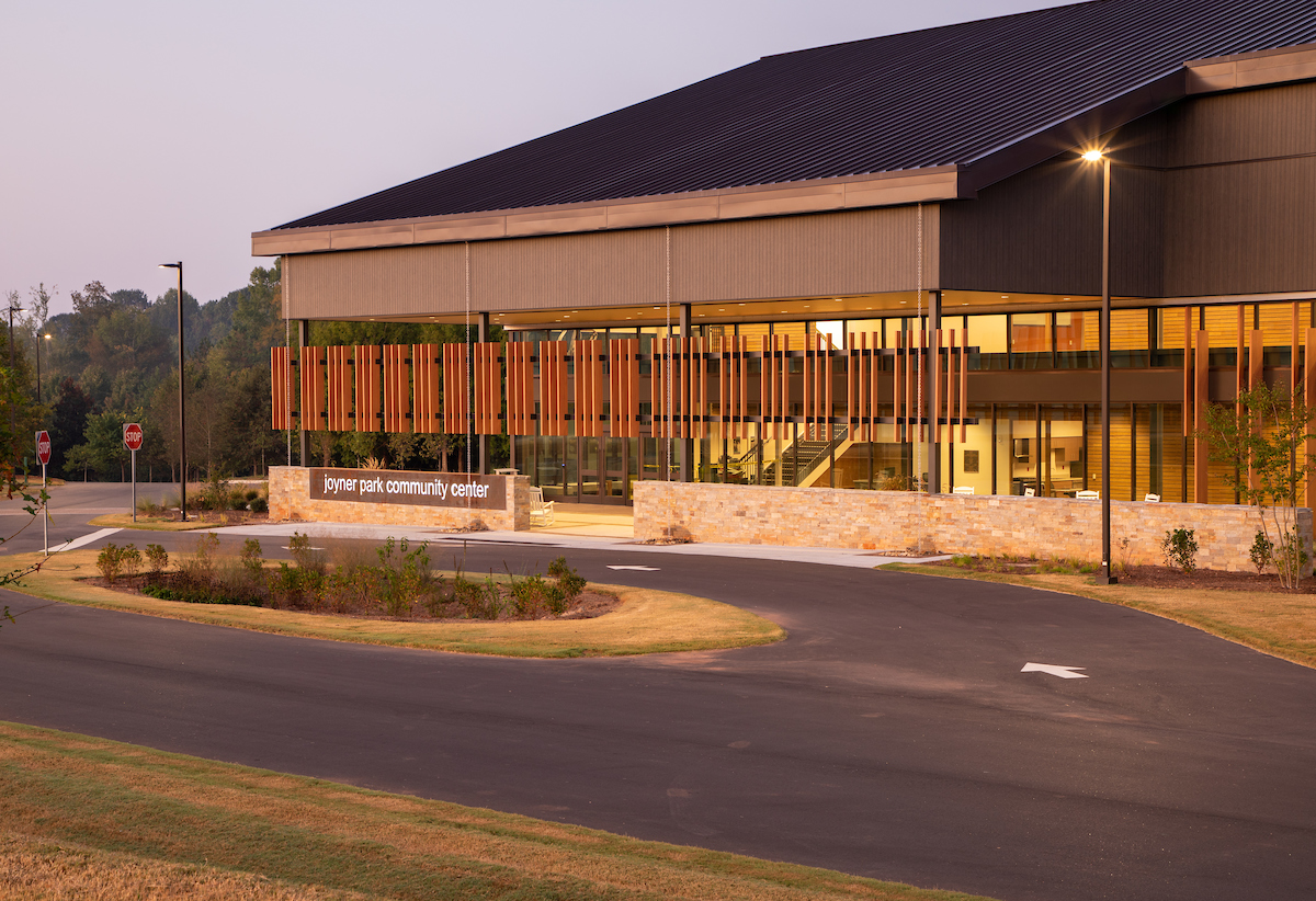 Designed to blend in with current Joyner Park structures and the natural habitat, the 32,000-square-foot facility features a walking track, gymnasium for basketball, volleyball and pickleball, multi-purpose rooms, dance studio and kitchen.