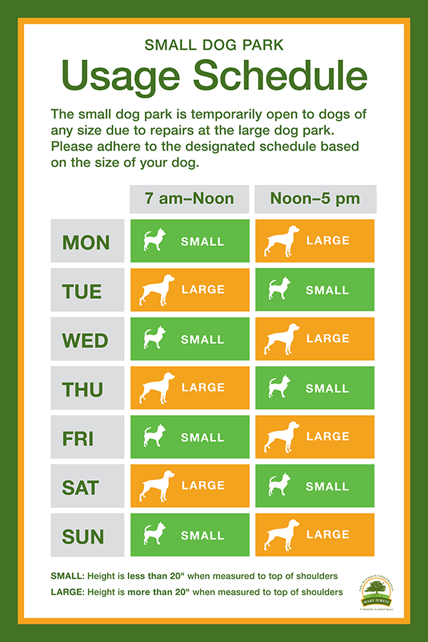 During the closure, the PRCR Department will implement a temporary usage schedule that will allow small dogs and large dogs to rotate daily usage of the small dog park. For more information, email PRCR Maintenance Manager Randy Hoyle.