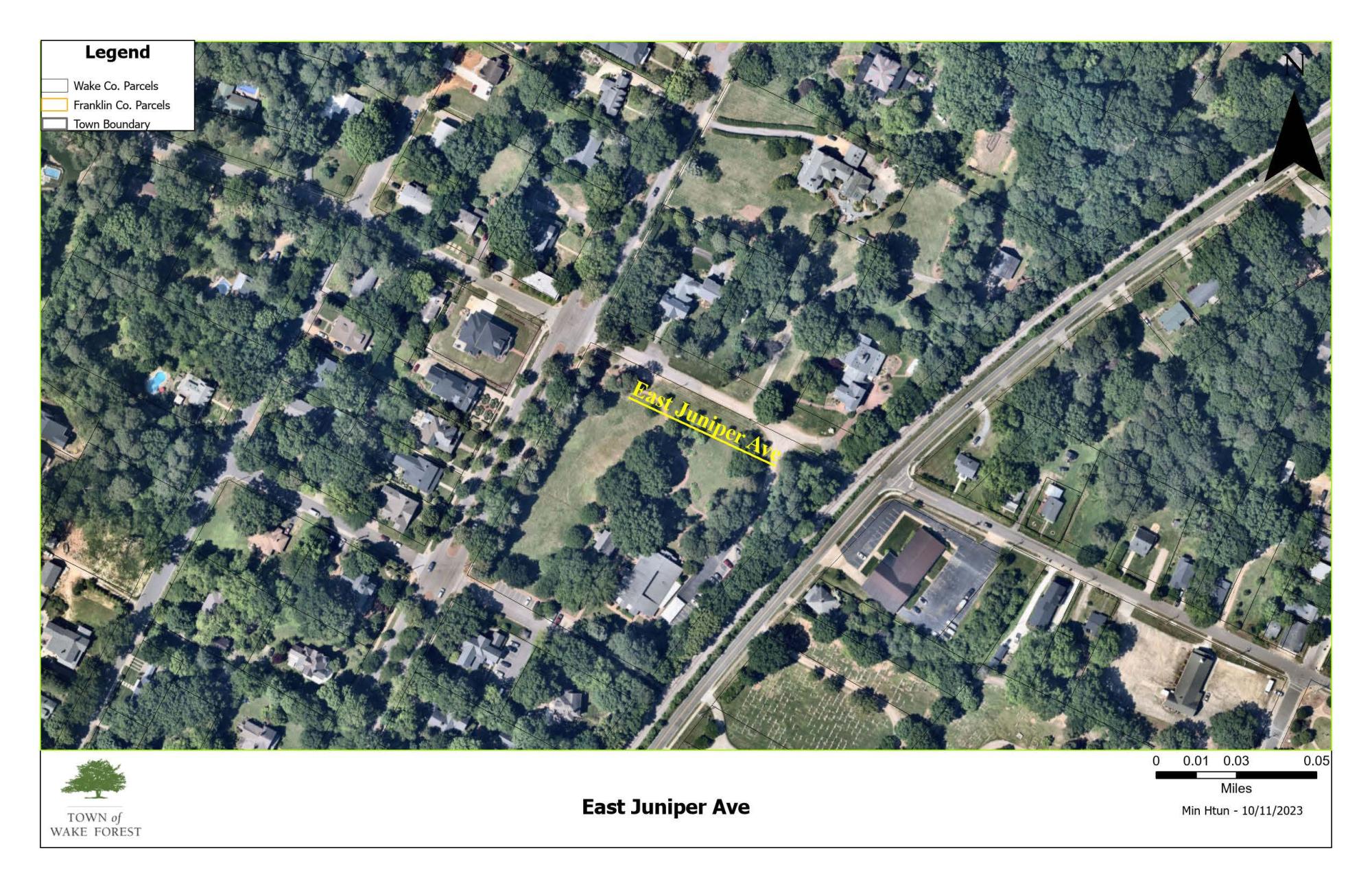 The Town of Wake Forest owns and maintains E Juniper Ave. The existing street has approximately 428 linear feet from N Main Street to Cul-De-Sac. Approximately, the street has 20 ft of width, and the length of the street are 200 linear feet of asphalt pavement and approximately 228 ft of gravel street.